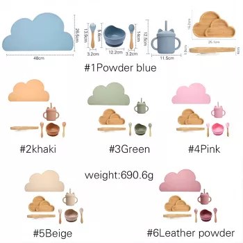 6-Piece Wooden Clouds Dinner Plate & Silicone Baby Feeding Set – Eco-Friendly Baby Tableware Gift