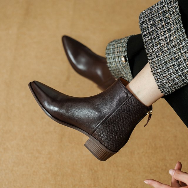 Winter Genuine Leather Pointed Toe Chunky Heel Ankle Boots for Women
